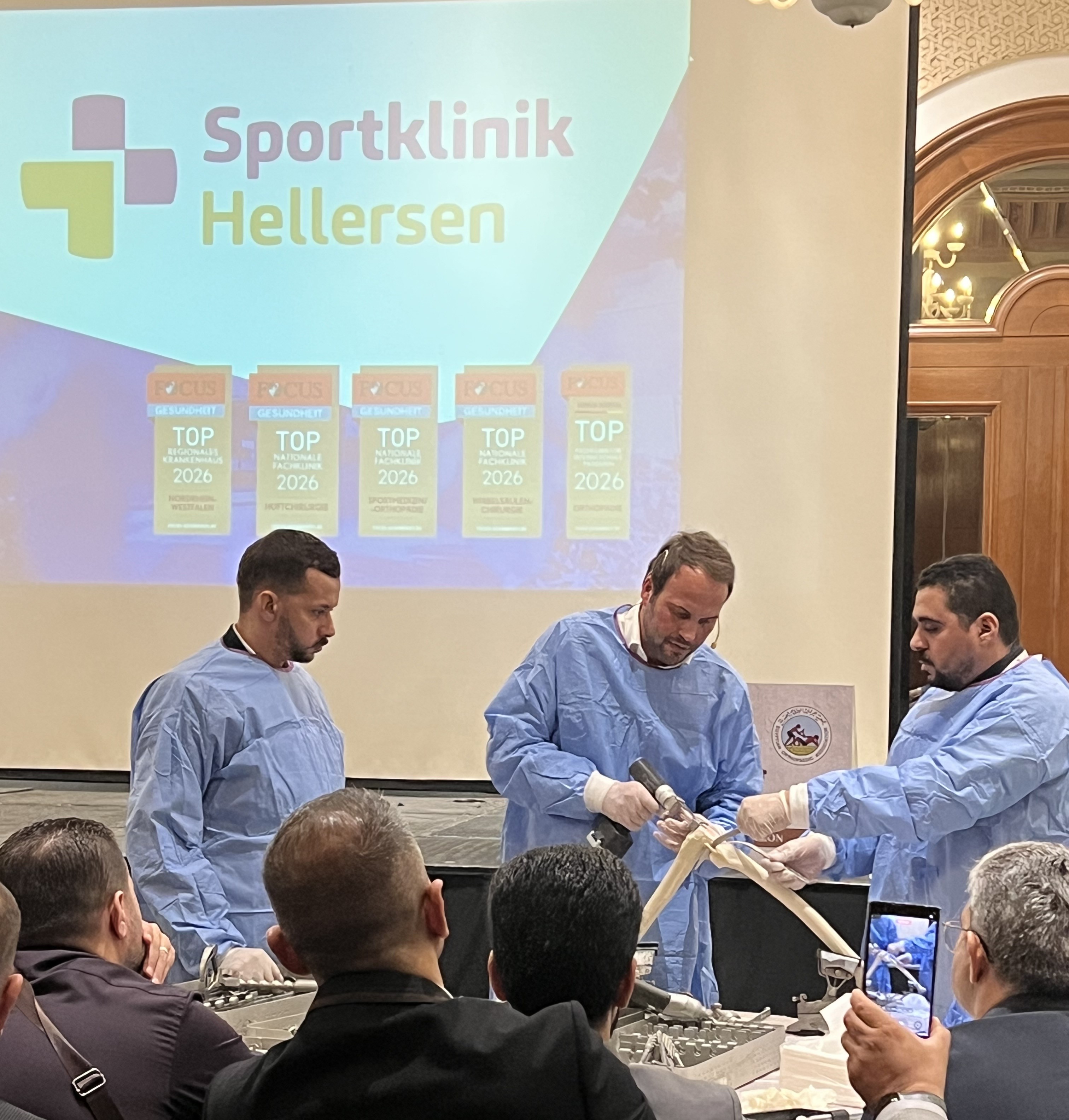 Höhepunkt des viertägigen Fachprogramms waren zwei Live-Operationen, die direkt aus den OP-Sälen der Sportklinik Hellersen nach Kairo übertragen wurden: eine roboterassistierte Kniegelenksoperation mit der VELYS™ Robotic-Assisted Solution sowie eine Kreuzbandoperation. Als eine der ersten Einrichtungen in NRW hat die Klinik roboterassistierte Eingriffe als festen Bestandteil der Endoprothetik etabliert und damit neue Standards gesetzt. Die Kombination aus modernster Technik und hochspezialisierter chirurgischer Expertise ermöglicht Implantationen mit maximaler Präzision und individueller Anpassung – ein weiterer Beleg für die Vorreiterrolle der Sportklinik Hellersen. Die Eingriffe wurden in Kairo von den verantwortlichen Chefärzten – Dr. Stefan Schmidl und Dr. Markus Leyh – live kommentiert und fachlich erläutert.